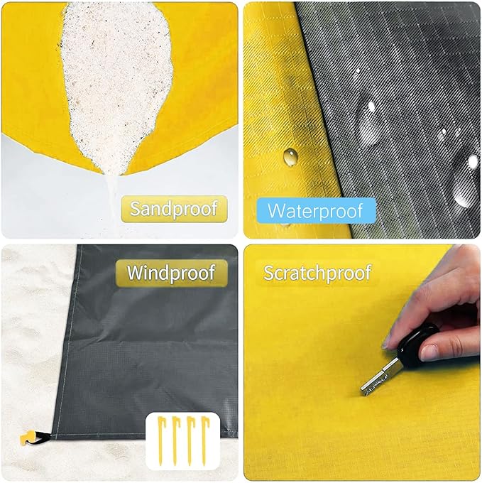 • ✔OUTSIDE BEACH BLANKET - The extra-large beach blanket provides ample space for lounging, picnics, or family gatherings. Including 1 * Sand Proof Beach Mat;4 * Durable ABS Anchors Stakes; 1* Carabiner; 1 * CARRY BAG.Whether you're at the beach, park, or camping, this oversized picnic blanket ensures comfort and convenience. Keeps all your beach stuff & beach supplies sand-free