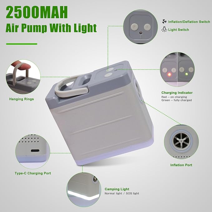 - ใ๐ฅ๐ฒ๐ฐ๐ต๐ฎ๐ฟ๐ด๐ฎ๐ฏ๐น๐ฒ & ๐ฅ๐ฒ๐บ๐ผ๐๐ฎ๐ฏ๐น๐ฒ ๐๐ป๐๐ฒ๐น๐น๐ถ๐ด๐ฒ๐ป๐ ๐๐ถ๐ฟ ๐ฃ๐๐บ๐ฝใ- The built-in air pump contains 2*2500mAh high-capacity battery, can fill inflatable camping pad quickly. Pump is rechargable and removable. One full charging time 3.5 hours and can inflate the memory foam sleeping pad about 7 cycles. Air pump features normal light and SOS light function, convenient for camping. it also has a hook to be attached to the tent. Pls not use it continuously for more than 5 mins and Let it cool down before using again.