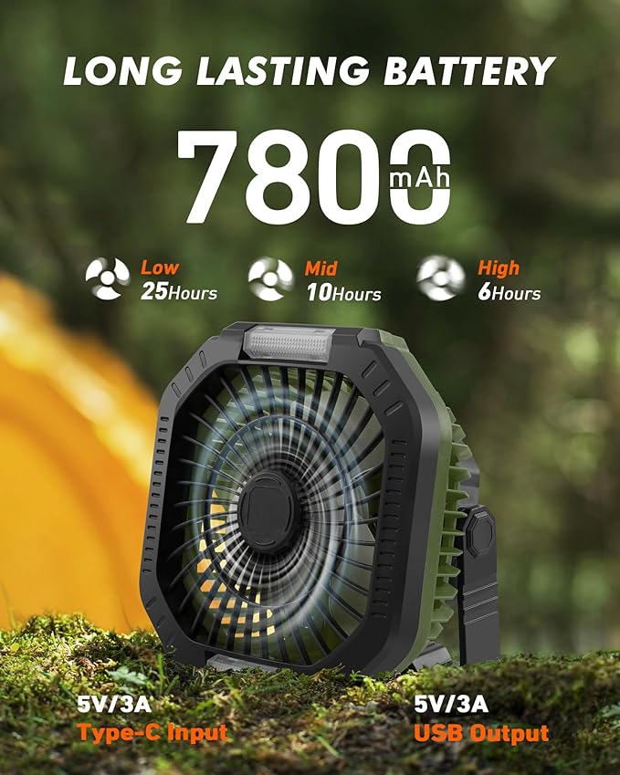 - β π£π’πͺππ₯ππ¨π & ππ’π‘π πππ¦π§ππ‘π πππ π£ππ‘π πππ‘ - Equipped with 7800mah powerful battery, the camping fan light can be used continuously for 25 hours, and supports working while charging. Battery powered fan can be fully charged in 5-6 hours. It also supports reverse charging, which can provide emergency charging for your phone, GPS, iPod, and other devices. You don't have to worry about running out of power when going out anymore.