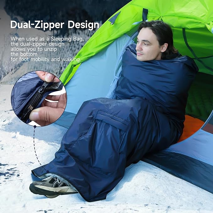 - 【Insulated Sleeping Bag】Easily zip it into a spacious sleeping bag (74.8" x 28.5") . The dual zipper design allows easy foot movement, while the 100g/㎡ shaped cotton filling delivers efficient insulation, even heat distribution, and all-night warmth.