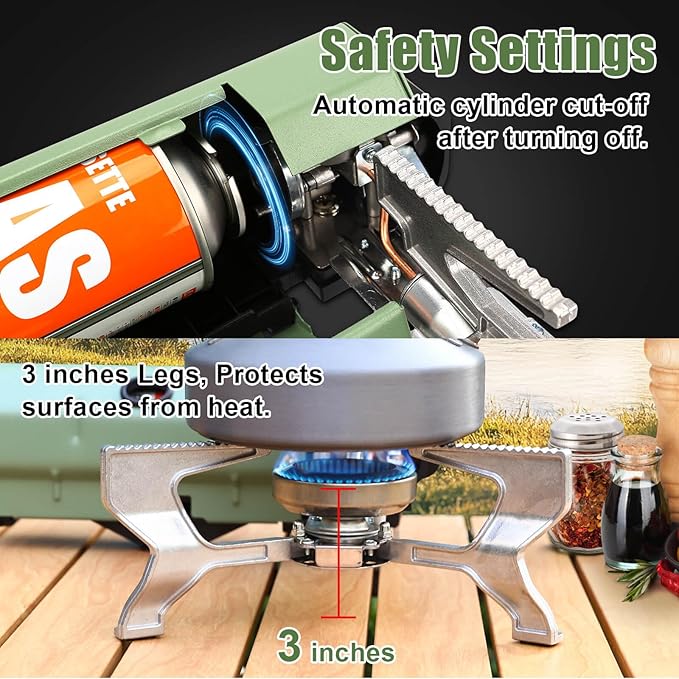 - [Safety First] - Designed with an anti-leakage system and magnetic over-pressure protection valve, the stove automatically cuts off gas supply if pressure is too high, ensuring safe and worry-free operation. With 3-inch tall legs, the stove keeps your cooking surface elevated, preventing heat damage to tables or other surfaces. Ideal for safe use on any outdoor setup.