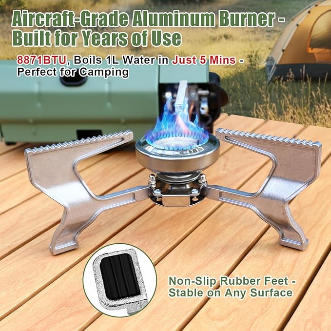 - [Powerful & Efficient Performance] - With a robust 8871 BTU/2600W output, the Hisencn camping stove delivers fast boiling and efficient cooking. Boil 1L of water in just 5 minutes, perfect for quick meals during outdoor adventures.