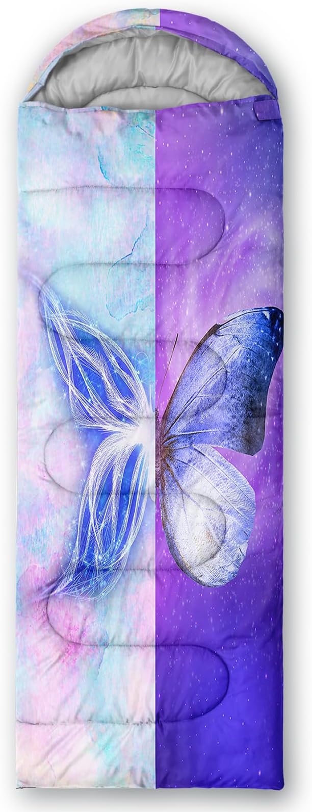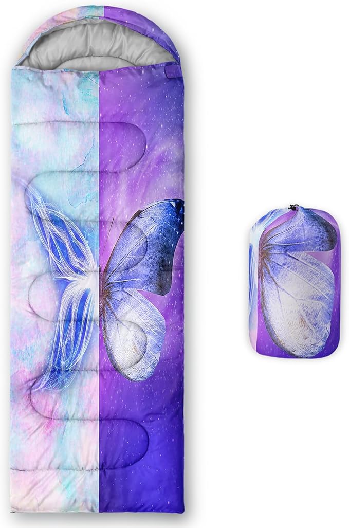 - Unique Butterfly Design:This Butterfly pattern sleeping bag is made of 3D digital printing with vibrant colors and patterns,size: 31W x 90L inches,temperature range: 32℉-77℉ (0℃-25℃),it also also have a weather resistant waterproof design to keep you warm and prevent you from any dampness,can be used in 3 seasons