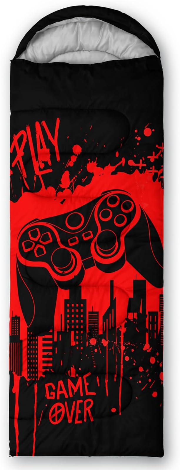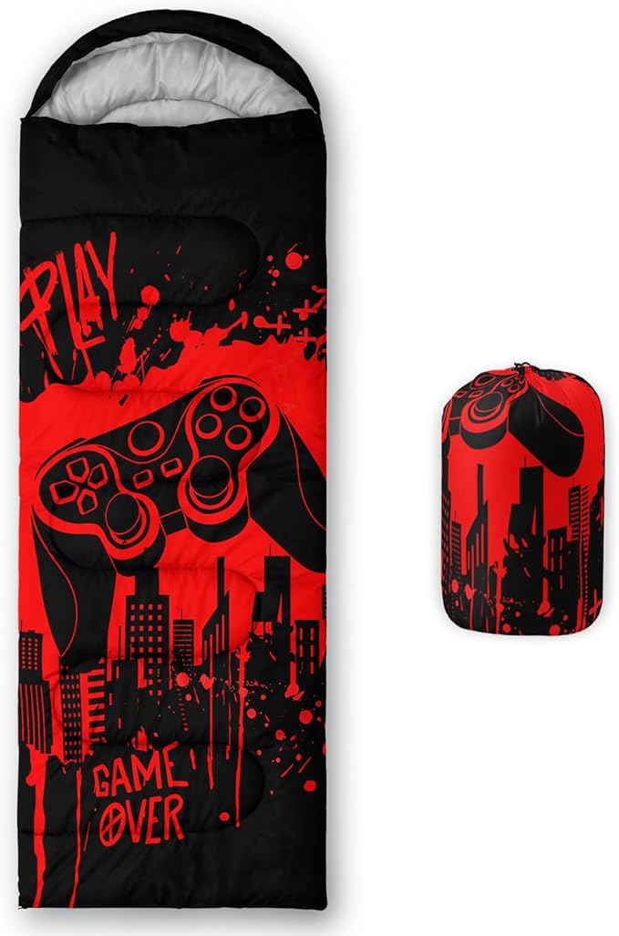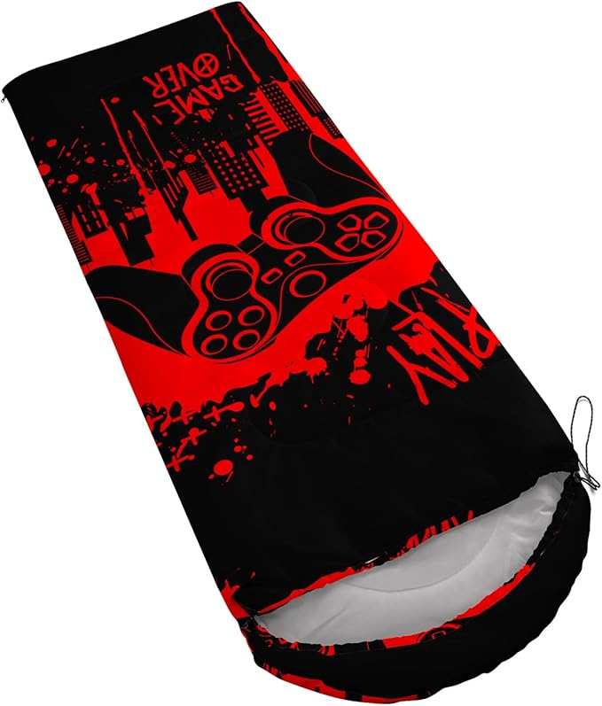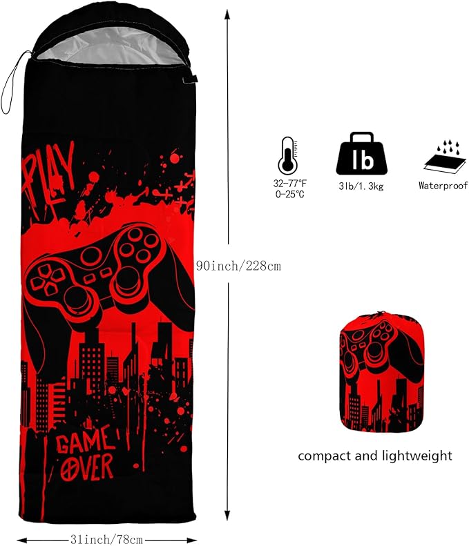 - Unique Gaming Design:This Gaming pattern sleeping bag is made of 3D digital printing with vibrant colors and patterns,size: 31W x 90L inches,temperature range: 32℉-77℉ (0℃-25℃),it also also have a weather resistant waterproof design to keep you warm and prevent you from any dampness,can be used in 3 seasons