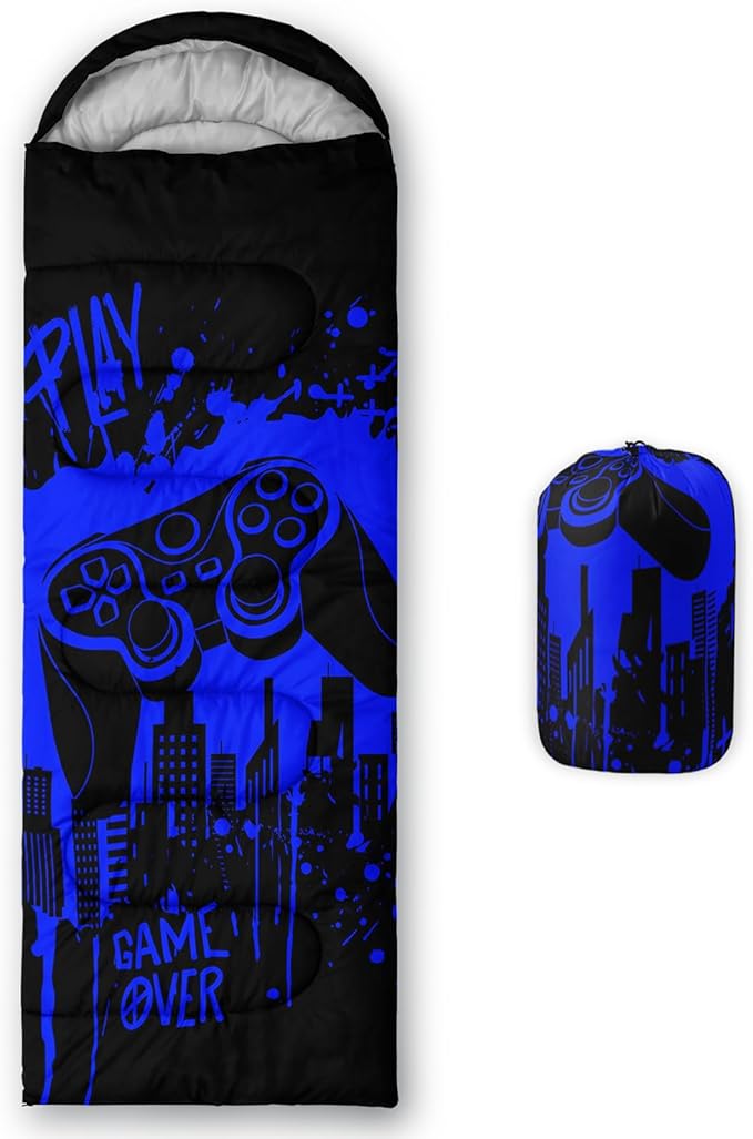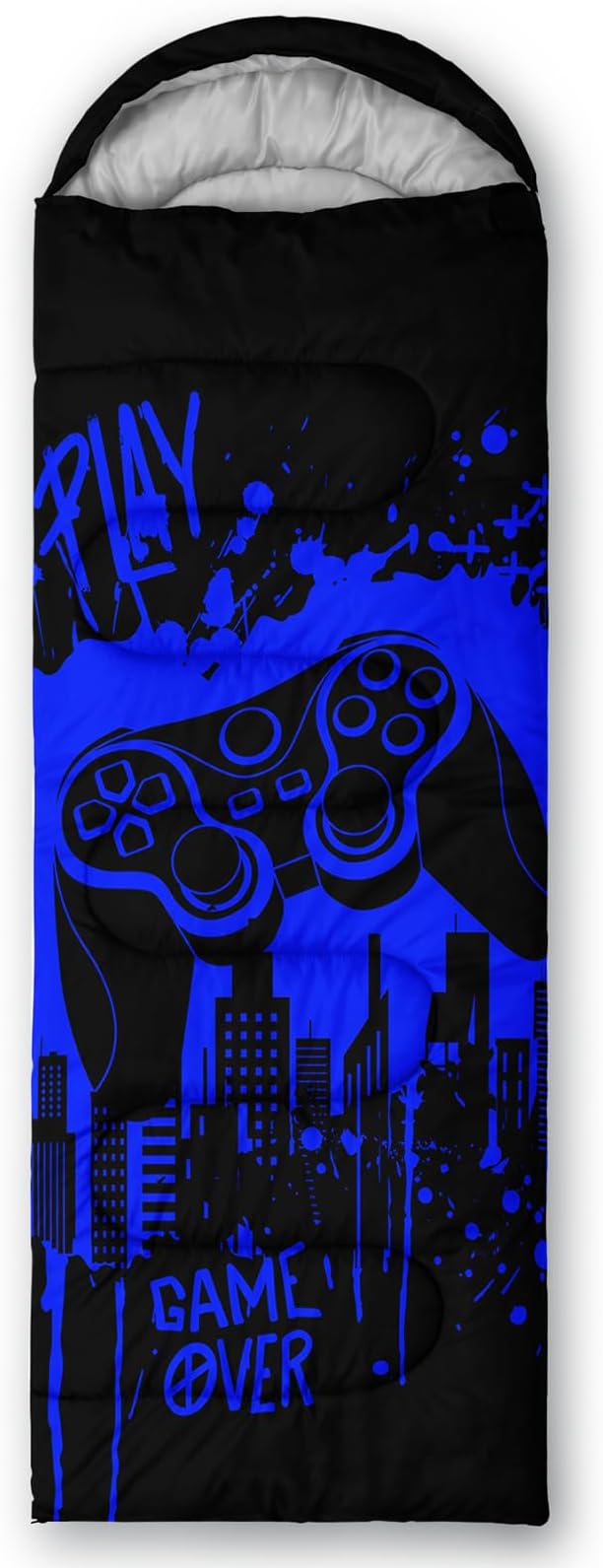 - Unique Gaming Design:This Gaming pattern sleeping bag is made of 3D digital printing with vibrant colors and patterns,size: 31W x 90L inches,temperature range: 32℉-77℉ (0℃-25℃),it also also have a weather resistant waterproof design to keep you warm and prevent you from any dampness,can be used in 3 seasons