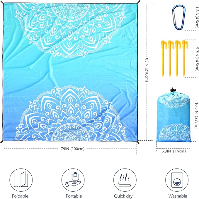 - 【Beach Accessories】 1 * Durable tear-resistant nylon beach mat, suitable for 1~3 people; 4 * Anchor stakes, can be firmly fixed in windy weather; 1 * Carabiner, convenient for carrying outside; 1 * Carrying bag, can be easily folded and stored in the beach bag.