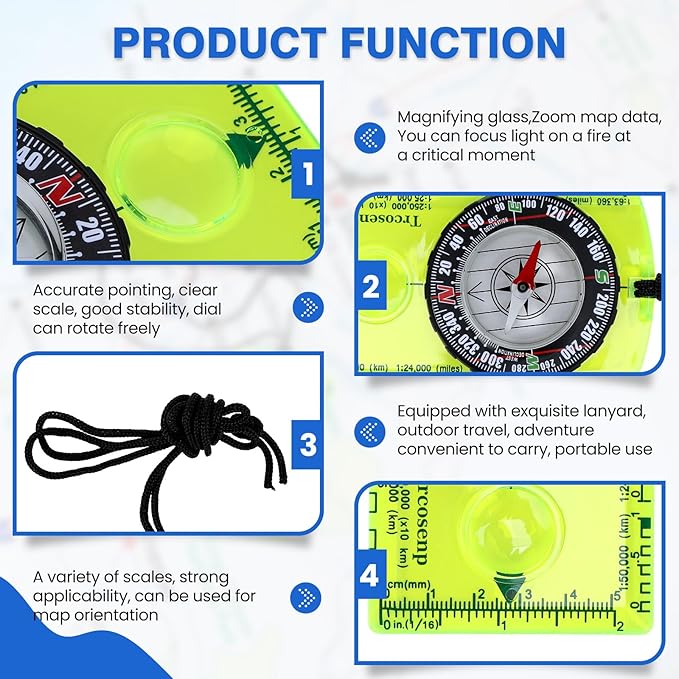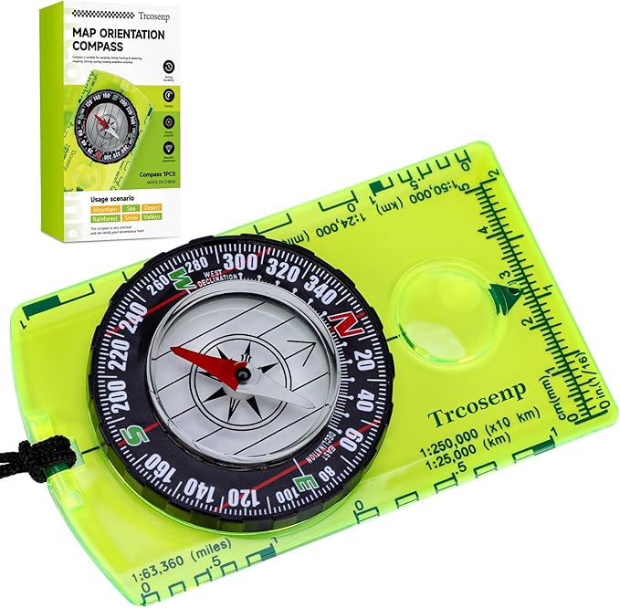 - HIGH QUALITY: This is a high quality product that it is a waterproof compass made with acrylic materials to prevent interference with the magnetic needle and ensure accurate readings. It is durable, compact, and portable, that makes it perfect for every outdoor activity,The Magnifying Glass is used for reading and navigating geological maps. Along with this, it has the compass Ruler Scale of 1:24000 for precise route mapping