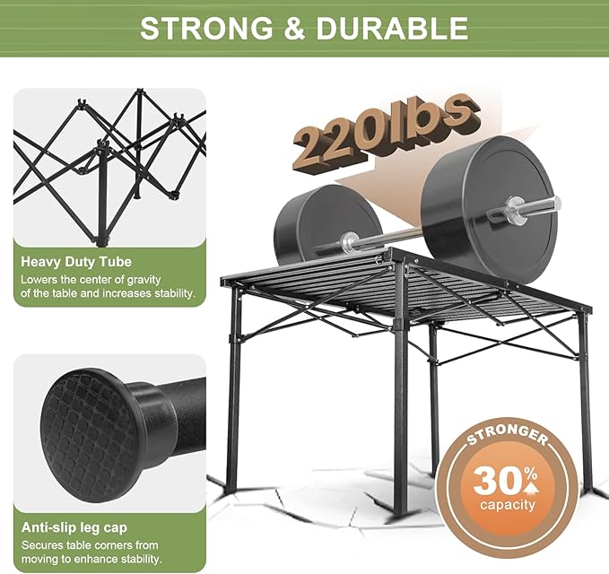 - Strong & Durable: The high-quality materials and construction make our outdoor folding camping table exceptionally strong and durable, with a load-bearing capacity of up to 220 pounds—at least 30% higher than standard tables. Due to the stable anti-slip foot caps, the foldable table legs will not fall off, allowing it to be used on different terrains without the risk of tipping over. Also, our camping picnic table is designed with a low center of gravity, which ensures the table remains stable under high loads.