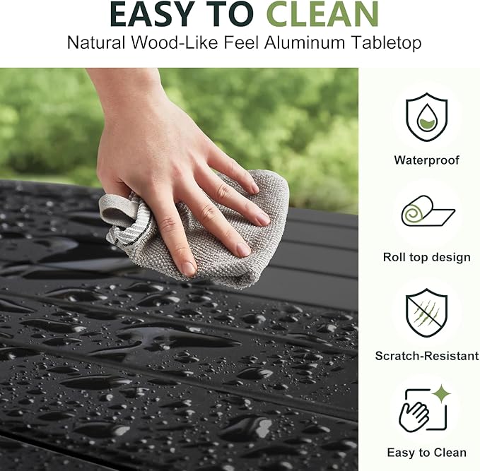 - Colourfast and Waterproof Aluminum Top: Crafted from premium aluminum alloy, the tabletop is waterproof, rust-resistant, and easy to clean, making it the perfect surface for outdoor use. The sturdy design of this camping portable table ensures reliable performance in all weather conditions.