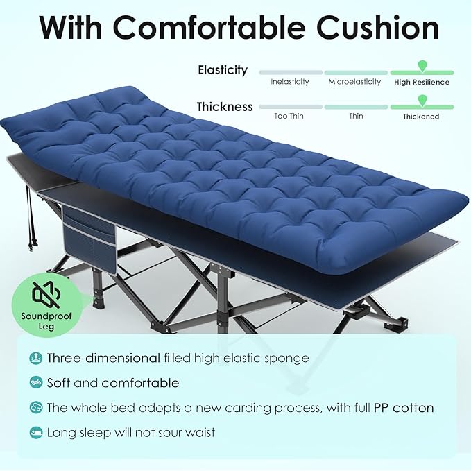 - 【Built-in Pillow Design】The headboard of our cot is a slanted design with built-in pillows, no need for extra pillows. The slight incline is ergonomically designed to ensure no more back, neck or shoulder pain in sleep! The mattress is also soft and thicker, so this is a very comfortable folding camping cot