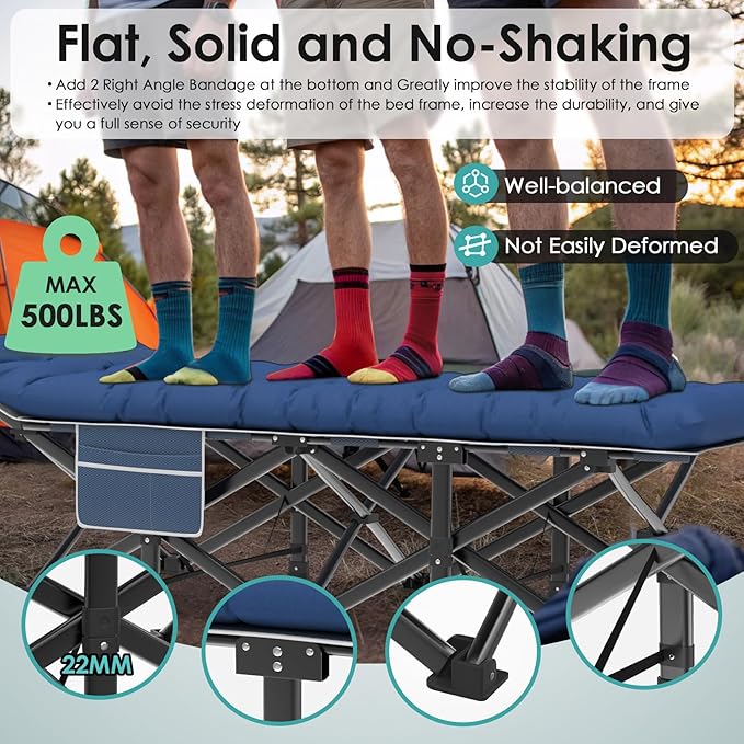 - 【Premium Material】Suteck adults camping cot bed is made of 25mm square anti-rust steel frame, durable 1mm thickened tubing and double layer 1200D Oxford cloth. Superior Strength, Water Resistance & Easy- Cleaning. More durable and supportive than 600D Oxford cloth, it can hold up to 900 lbs. There are 10 support legs, each with non-slip pads, and two right-angle bandages for stability and a comfortable sleep