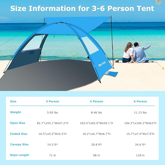 - Wide Space Canopy Tent: Gorich Beach Tent features a dual-door design with a canopy, doubling the shaded space and movement area. Open the doors to convert them into two beach mats for extra activity space. When the sun is strong, just prop up the canopy to get a larger shade area. Ideal for beach outings, camping, parks, and lakeside trips. Size: 106.3"L x 106.3"W x 63"H (6-person model)