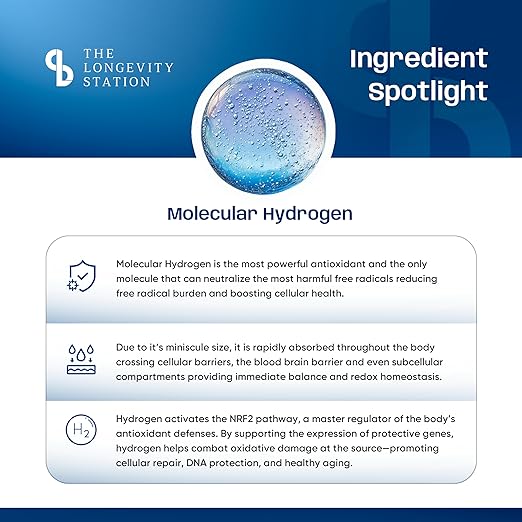 - Molecular Hydrogen is the smallest molecule that exists and serves as a powerful antioxidant within the body. Due to its miniscule size, it crosses cellular barriers and absorbs easily throughout the body. Hydrogen rapidly provides balance in the body by neutralizing free radical damage and oxidative stress. By achieving this at the cellular level, this is a recipe for longevity and anti-aging and is the ultimate wellness companion to take your health to the next level.
