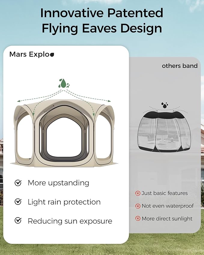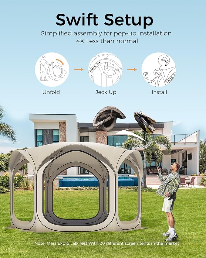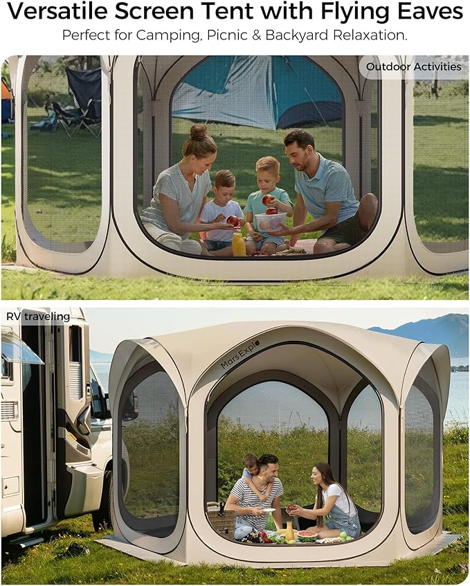 - Bug-Proof & Superior Ventilation:This 12x12 pop-up screen tent is designed with a 4-sided fine mesh structure to provide 360° ventilation, keeping mosquitoes and bugs at bay while offering a cool and comfortable outdoor environment. The high-quality Oxford fabric with a UV-resistant silver coating ensures all-day protection with UPF 50+ to shield you from harmful sun exposure. Ideal for picnics, camping, and other outdoor activities, it creates a bug-free and sun-safe haven.