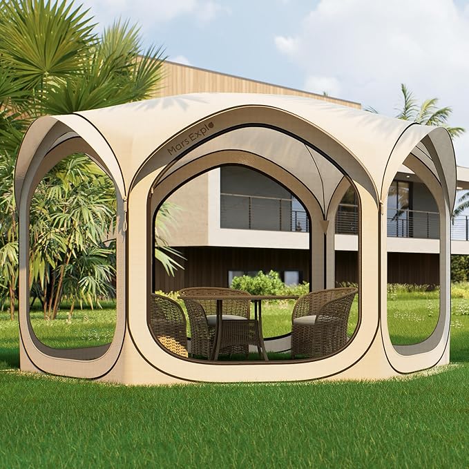 12x12 FT Pop-Up Screen Tent, Portable Screen Room Canopy with Zipper Doors for Patio, Backyard, Deck & Outdoor Activities, Beige