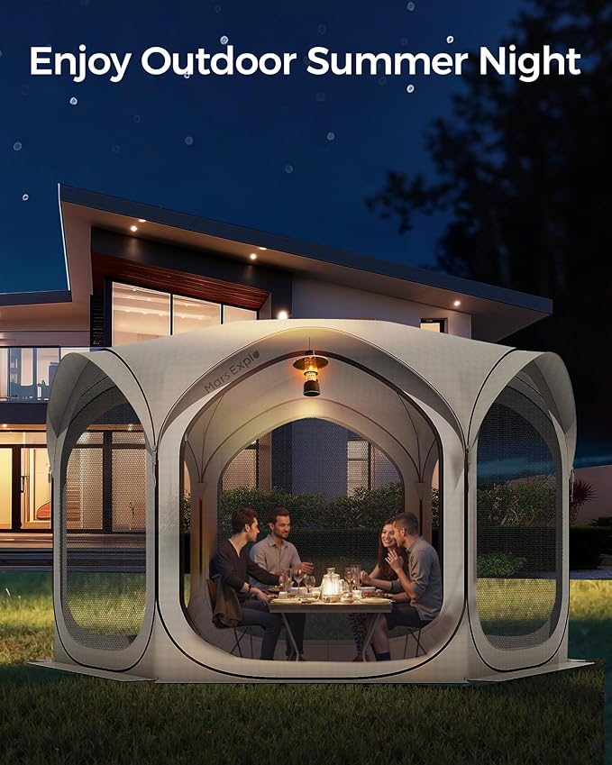 - Versatile Day & Night Use:This tent is perfect for both daytime and nighttime use. Equipped with a hook on the top for hanging a lamp and support for light strips (sold separately), it offers plenty of lighting options for evening activities. Whether you’re hosting a gathering, enjoying an afternoon picnic, or providing a safe play space for children, this 12x12 screen tent is your ideal outdoor companion.