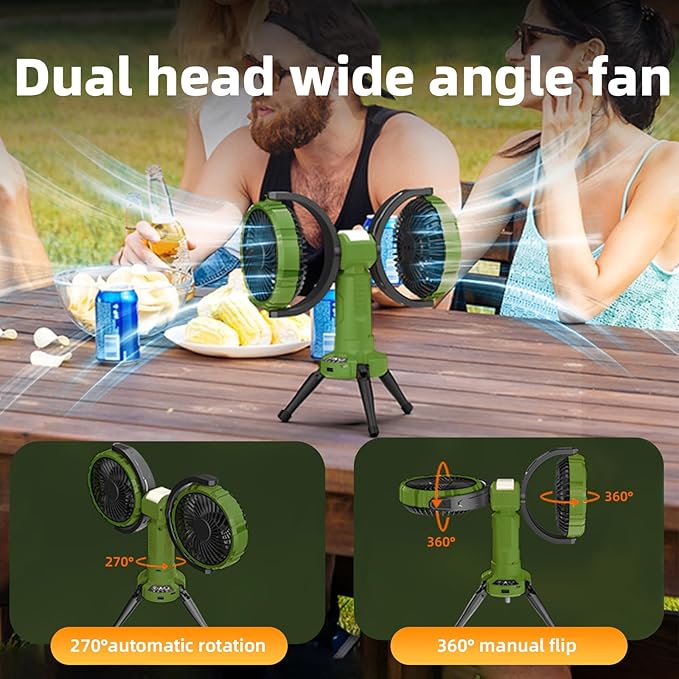 - 【Double Head Fan & Oscillation】 Unlike ordinary camping fans on the market, this camping fan has two air outlets, each outlet supports 360° manual adjustment of the angle, and the fan as a whole supports 270° automatic oscillation, so it can blow in different directions at the same time, with a wider range of airflow, bringing coolness to more people.