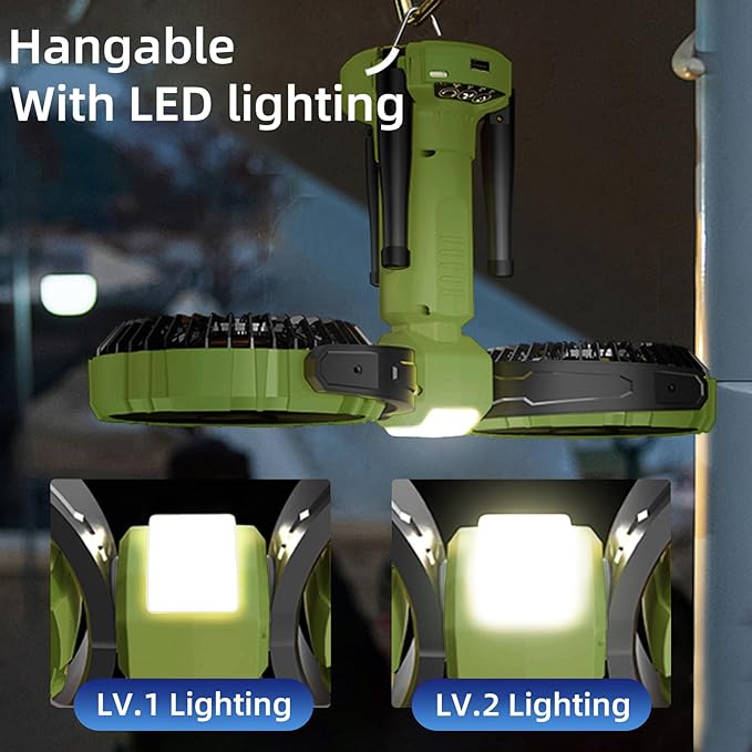 - 【Power Bank & 2 Levels of Light】This camping fan comes with a USB port, which can be used as an emergency backup power source for your cell phone and other devices.The camping fan also comes with 2 brightness modes of LED lights, which is suitable for use in low light environment or at night. The camping fan is a great choice for night camping or an ideal light source for hiking.