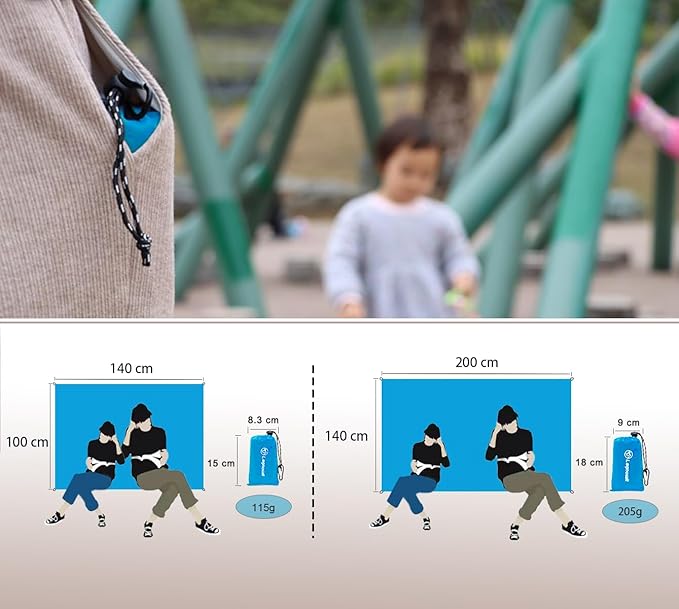 - Waterproof, Sandproof & Tear resistant -Made from Ripstop 210T Polyester Fabric with waterproof coating, our outdoor blanket is water-resistant, dries up fast and easy to clean, sand easily shaken off. This pocket blanket travel is sand free and it’s tear-resistant to encounter harsh outdoor weather. It can protect you and your outdoor camping gadgets accessories from moisture, twigs, grass, dirt, insects etc.