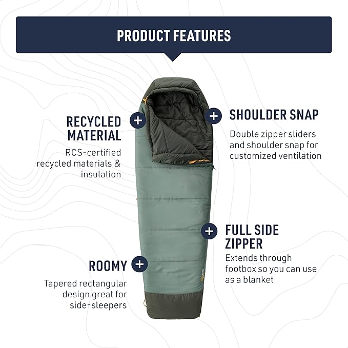 - Roomy, tapered rectangular synthetic sleeping bag ideal for side-sleepers; provides superior comfort and versatility for outdoor adventures like camping, fishing, trekking, and travel