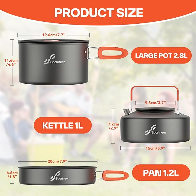 - Camping Cookware Set: Sportneer Camping Cookware Set includes: 1 boiling pot (2.8L) + Kettle (1L) +1 frying pan (1.2L) +2 stainless steel cups+ 2 stainless steel plates+2 sets of dinner cutleries (2 x forks, 2 x knives, 2 x spoons) + 1 cleaning cloth + 1 Carry bag. Fully equipped and made for 1 to 2 people.