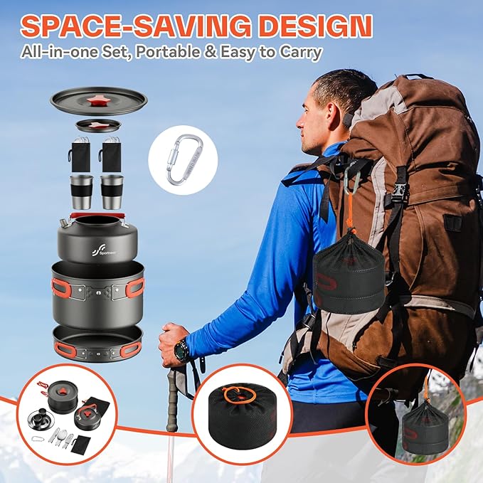Sportneer Camping Cookware, Non-Stick Lightweight Pots Pan Set with Stainless Steel Cups Plates Forks Knives Spoons for Camping, Backpacking, Outdoor Cooking and Picnic