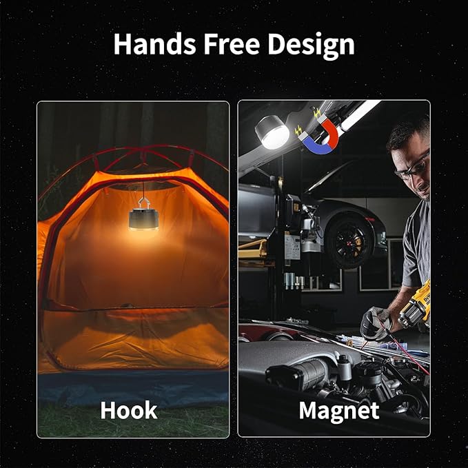 - 【 Powerful Hook and Magnet Design and Waterproof 】With the dual-use hook and magnet design, this light can not only be conveniently hung on tents and branches, but can also be firmly fixed on metal surfaces. IP65 waterproof camping light. Strong and durable, long lasting. Perfect for any outdoor activities such as backpacking, hiking, camping, fishing and more.