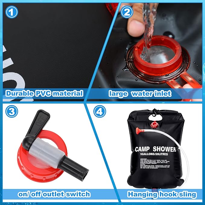 - Simple Usage: camp shower bag features an adjustable on/off switch, easy to control the water flow, and you can hang the bag conveniently on a tree, or in your tent, which can better wash your body, removing sand and salt, wash dishes, food, vehicles, and so on