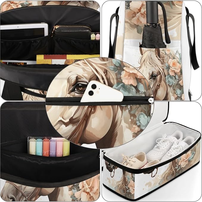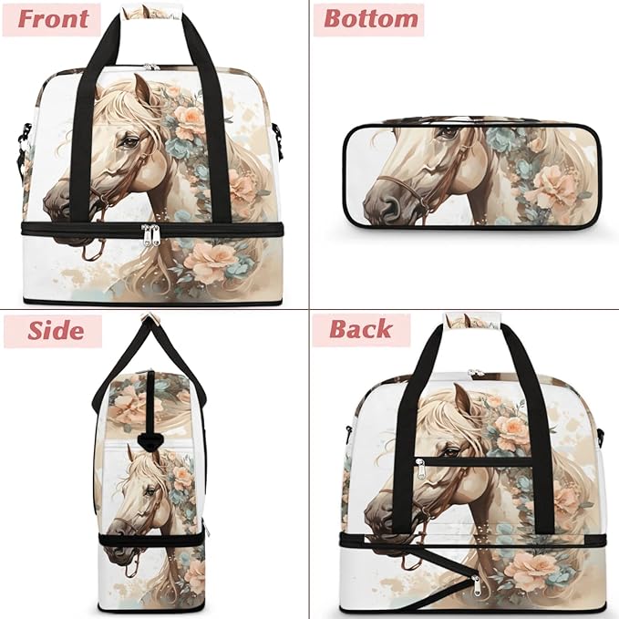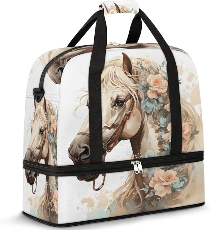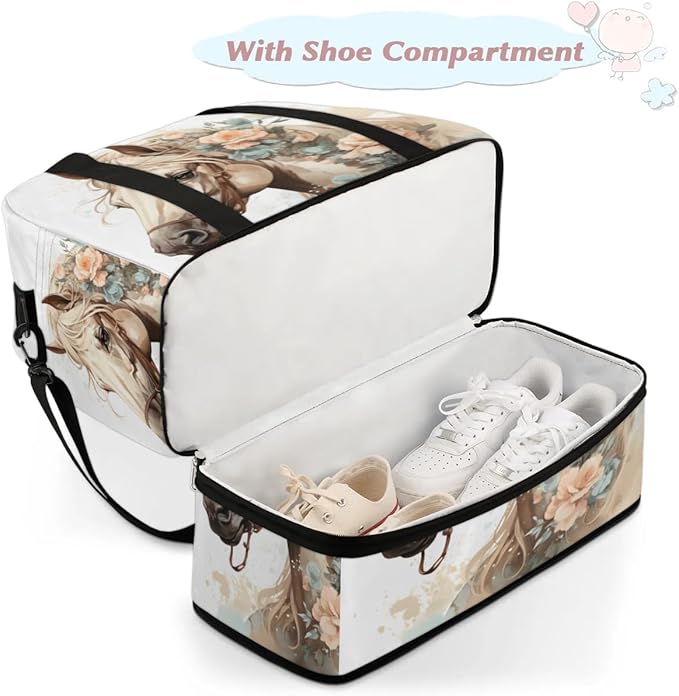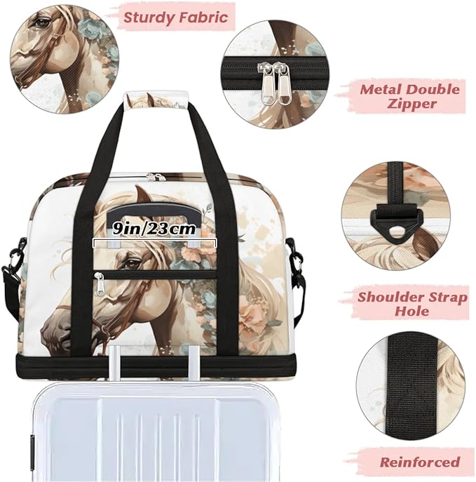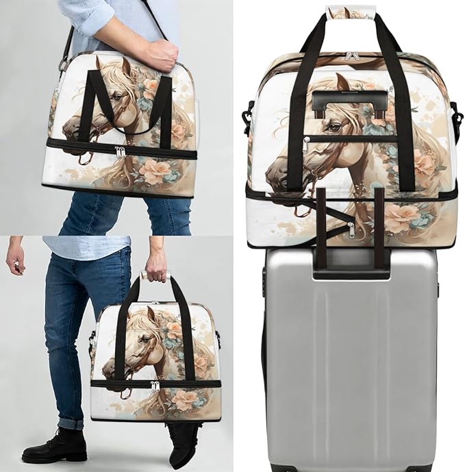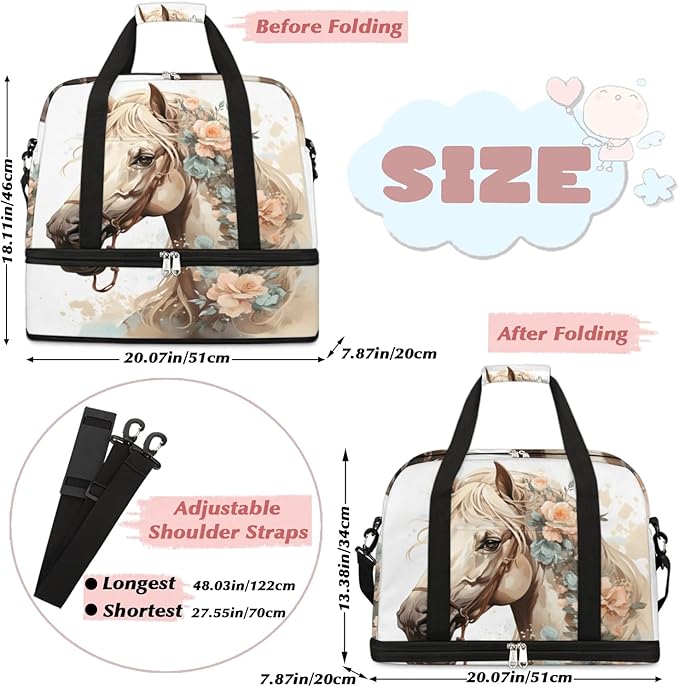 Foldable Travel Duffel Bag, Expandable Weekender Overnight Carry on Bags with Shoe Compartment Sport Tote Gym Luggage for Women Men, Horse
