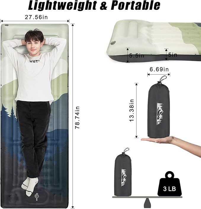 - Ultra-Thick Design for Comfort: This ultra-thick camping mat inflates to 5 inches, providing excellent support, the 5.5-inch pillow area offers extra comfort by fitting the body's natural shape. Measuring 78.7 x 27.5 inches, it's suitable for both back and side sleepers, isolating you from the hard, cold ground. Perfect for camping or outdoor adventures, it ensures improved rest and comfort in the great outdoors.