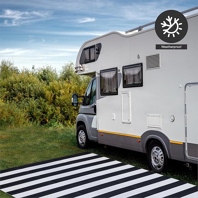 FH Home Outdoor Rug - Waterproof, Fade Resistant, Reversible - Premium Recycled Plastic - Striped - Large Patio, Deck, Sunroom, Camping, RV - Brittany Stripe - Black & White Crease Free - 5 x 8 ft