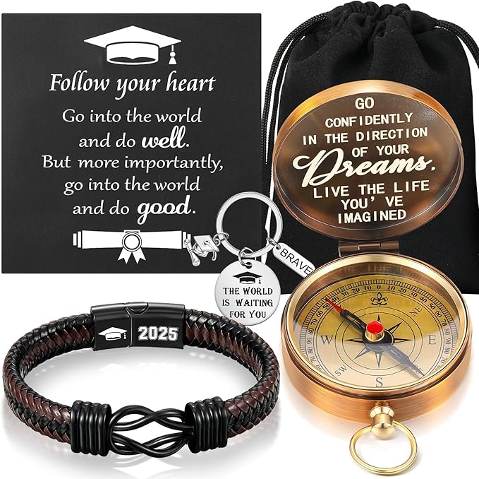 - Complete Graduation Gift Set: you will receive a leather bracelet, an inspirational card, a vintage compass, a 2025 graduation keychain and an elegant black drawstring bag, a thoughtful gift to congratulate them on this significant achievement
