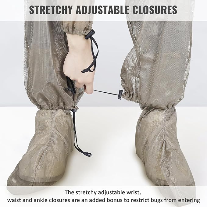 • 4-piece Insect Repellent Suit - The mosquito repellent suit comes as a jacket, pants, gloves and socks, covers all skin from bugs, yet let's air pass through so you stay cool. This full-body mosquito netting works for mosquitos noseeums ticks wasps bees and is pretty easy to manage