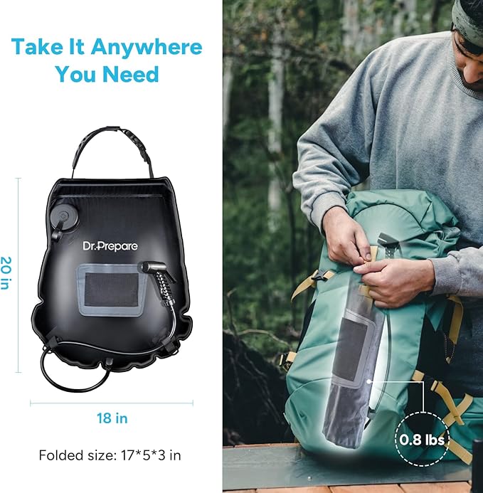 - Portable & Convenient Shower Bag: Our compact and lightweight camping shower bag (just 1.3 lbs when folded) is perfect for all your outdoor activities. Take it with you to the beach, hiking trails, or camping spots – it's easy to carry wherever you go!