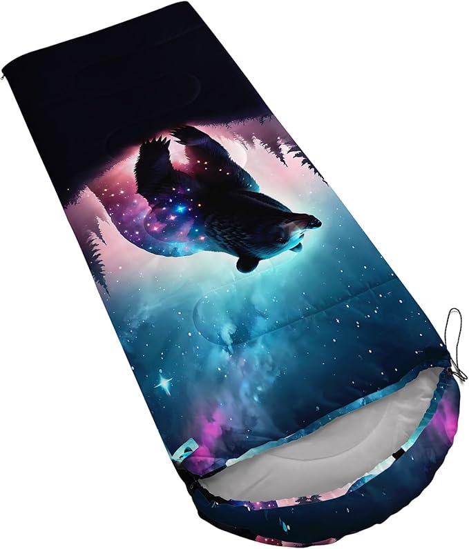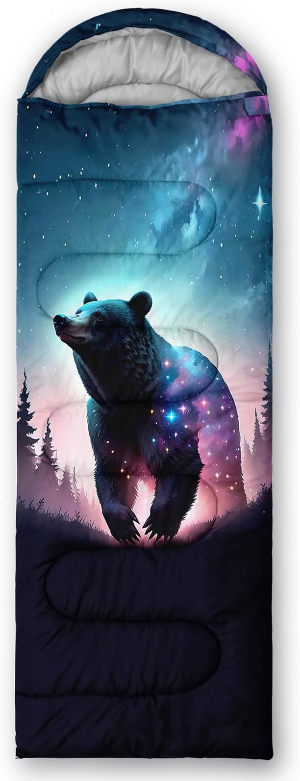 - Unique Bear Design:This Bear pattern sleeping bag is made of 3D digital printing with vibrant colors and patterns,size: 31W x 90L inches,temperature range: 32℉-77℉ (0℃-25℃),it also also have a weather resistant waterproof design to keep you warm and prevent you from any dampness,can be used in 3 seasons
