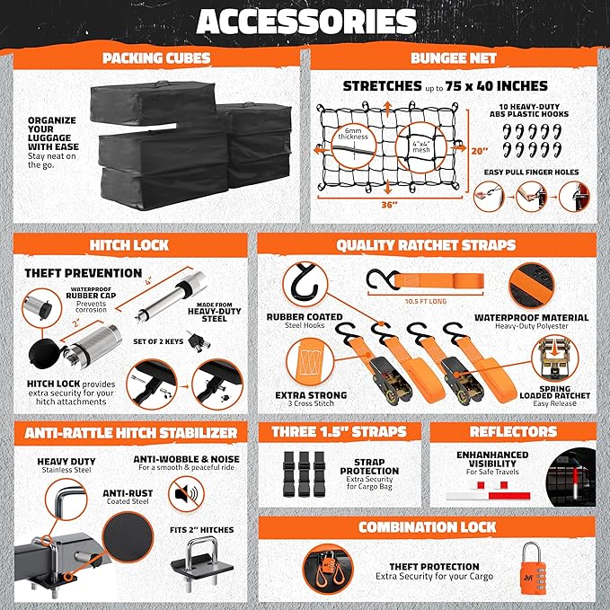 - FULL HITCH HAULER KIT: This package includes a weatherproof 500 lbs. capacity trailer hitch basket cargo carrier & a 30 cubic ft. tow hitch carrier bag. You'll also receive 6 Packing Cubes for organized storage. Designed for a secure, sway-free ride, the car hitch cargo carrier includes a hitch lock & stabilizer. With 3 durable buckle straps, 2 adjustable ratchet straps & a 36"x20" bungee net to secure your gear, this luggage rack for hitch provides a reliable solution for your hauling needs.