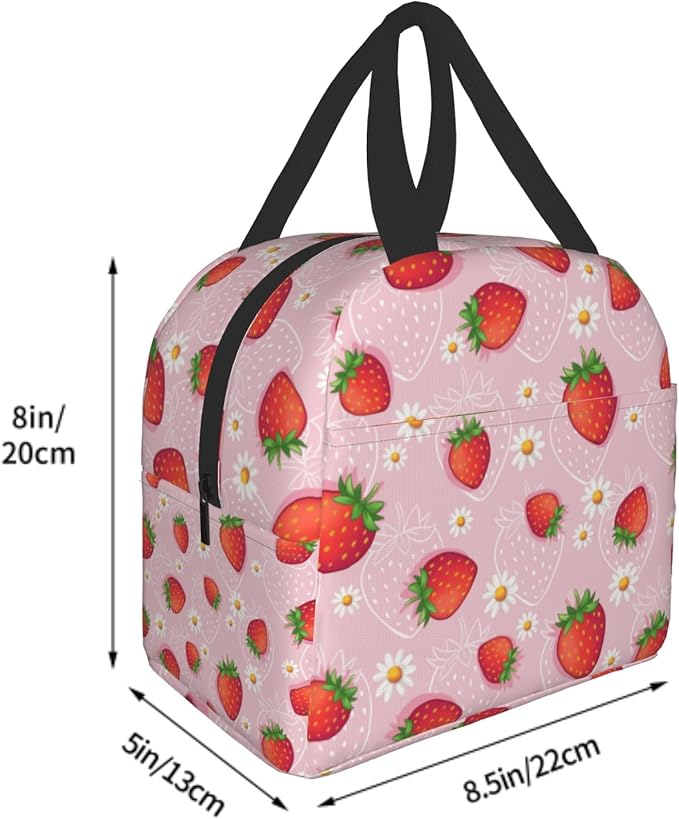 - PERFECT SIZE - The pink strawberry lunch bag is 8.5*5*8in /22*13*20cm. It has a main zippered compartment with a large capacity design, which can hold your lunch box, drinks, sandwiches, fruits, and snacks. Features a large zippered front pocket to store your utensils, napkins, phone, cards, and all essentials. Light weight easy to carry or hang on your arm like a stylish purse handbag.