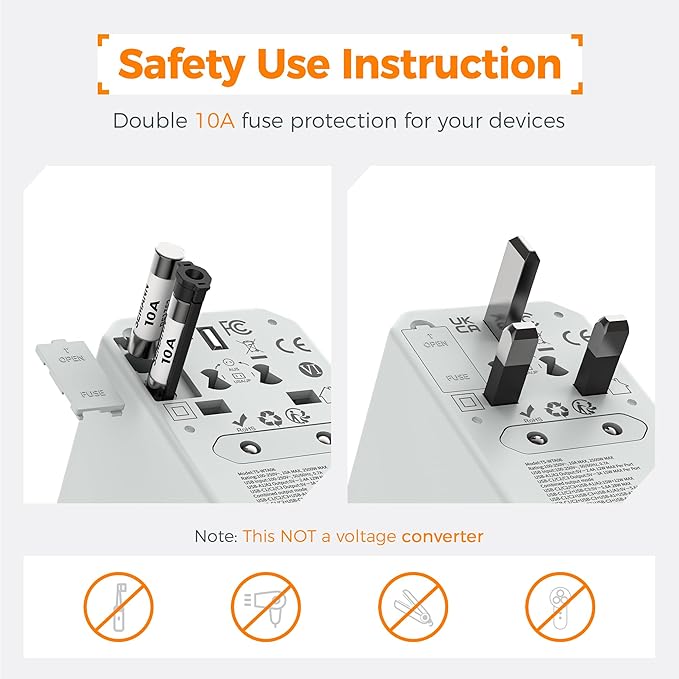 - Portable and Safety: The size and weight of this TESSAN worldwide adapter are 2.13× 1.97× 3.03 in and 6.04 oz, saving the space in your suitcase; This international travel adapter has double 10A fuse, protects your devices during use