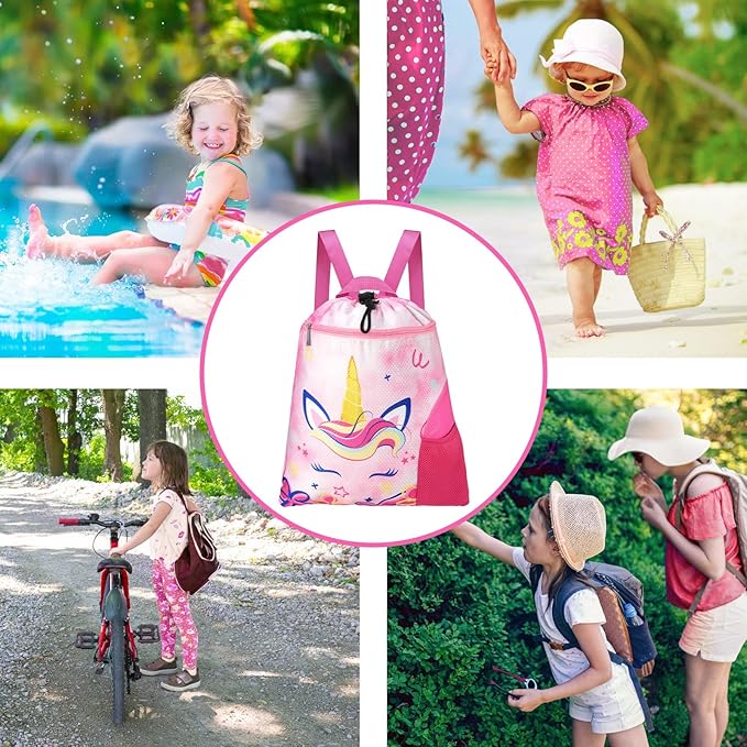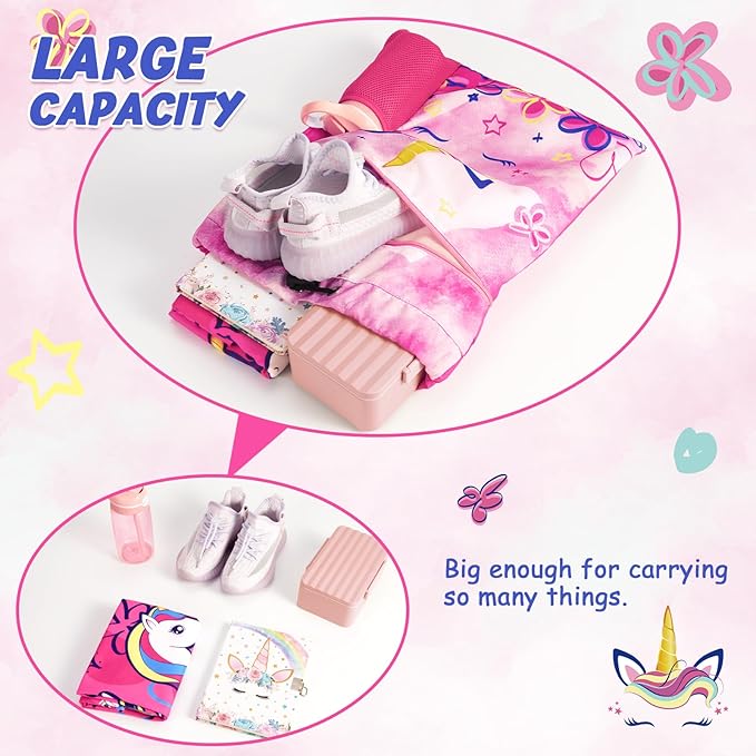 - ATTRACTIVE LOOK: Designed and manufactured by ourselves using an advanced printing process. Featuring a vibrant pink background, this kids gym bag showcases a lifelike unicorn, surrounded by playful small patterns. Whether used as a kids swim bag or a girls beach bag, its adorable design is sure to capture kid's hearts.