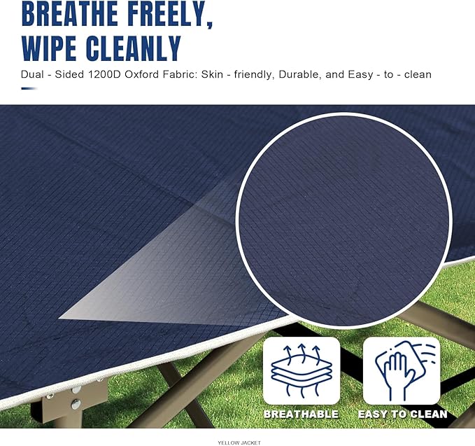 - All-Weather Durable Camp Cot: This foldable cot features double-layer 1200D Oxford fabric thatwithstands all seasons — breathable for summer use, and insulated for cooler weather. The tear-resistant material maintains comfort while being easy to clean, transitioning perfectly from backcountry adventures to guest room use year-round.