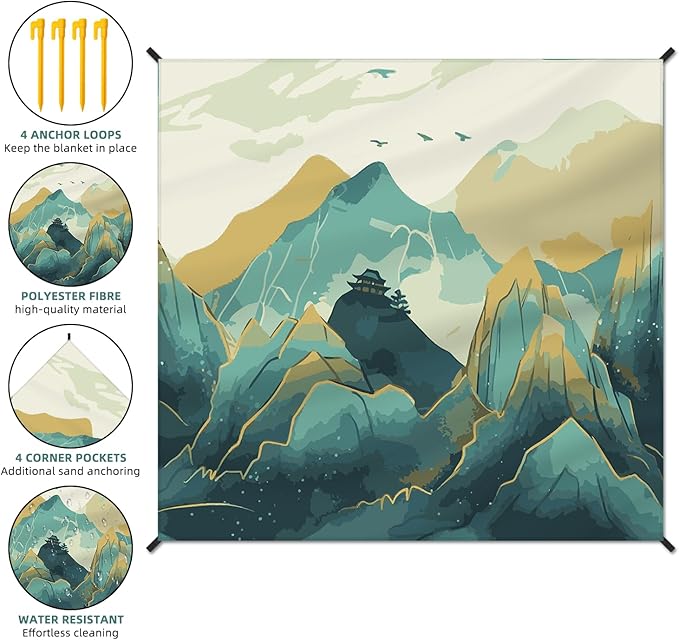 Beach Blanket Waterproof Sandproof Large Beach Mat 79" X 83" for 2-4 Adults Sand Free Mat Quick Drying,Lightweight & Durable with 4 Stakes & 4 Corner Pockets for Beach Travel Camping.(Mountain)