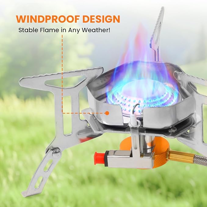 - Windproof Design with Enhanced Stability: Aluminum alloy windshield protects flames from wind interference; Three serrated pot supports prevent slipping; Reinforced legs maintain stability on uneven surfaces