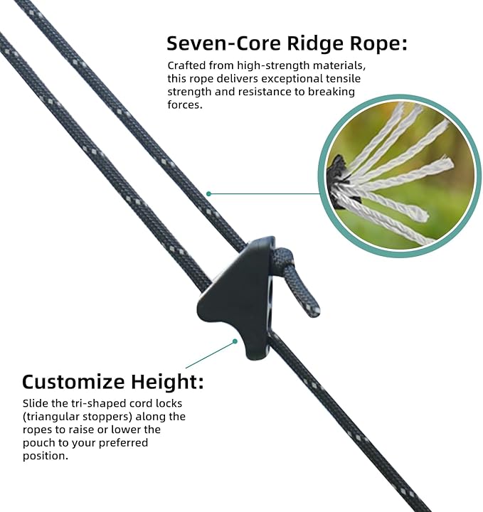 - 【High Load Capacity & Adjustable Height】Featuring two 1.3-meter-long, high-strength seven-core ropes, this pouch offers exceptional tensile strength and durability, supporting up to 50kg. The included triangular stoppers allow you to easily adjust the height by sliding the triangular rope locks, letting you position the bag at your preferred level.