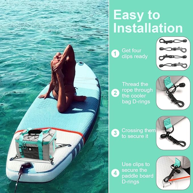 - 【Easy Installation】The MoiShow paddleboard cooler comes with four clips that easily secure via D-rings that attach to your paddle board. Bseides, it includes two longer elastic lanyards to ensure a secure fit on your paddle board, kayak, or any other occasion.