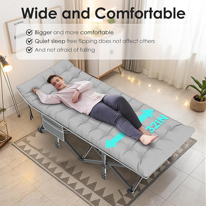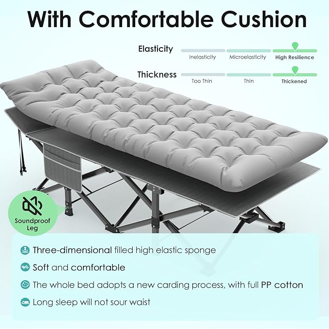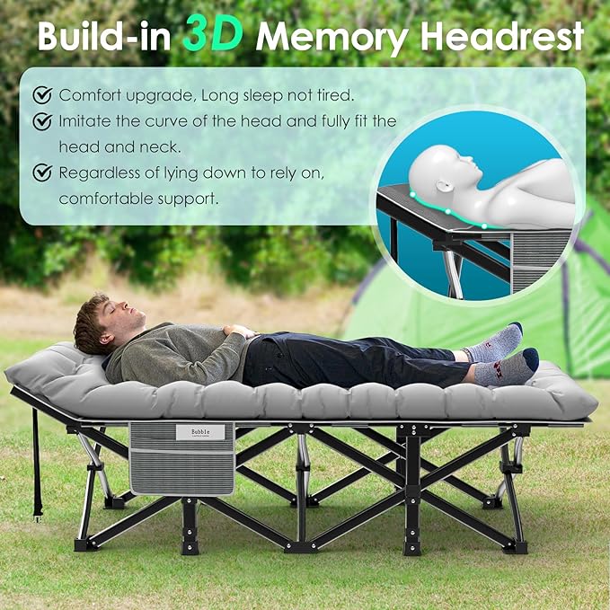 - 【Built-in Pillow Design】The headboard of our cot is a slanted design with built-in pillows, no need for extra pillows. The slight incline is ergonomically designed to ensure no more back, neck or shoulder pain in sleep! The mattress is also soft and thicker, so this is a very comfortable folding camping cot