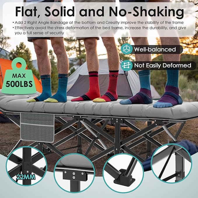 - 【Removable Skin-Friendly Mat】Our camping bed cot for adults has a soft and removable Mat, the 4" thicken cushion makes you more comfortable and warm when resting or sleeping. The cushion is made of skin-friendly and comfortable fabric, which is very suitable for people with sensitive skin or kids. You can also remove the mat when the weather is hot,and tie it up with the strap in it