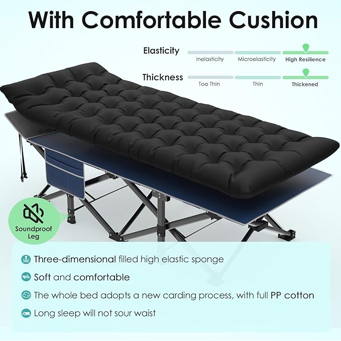 - 【Built-in Pillow Design】The headboard of our cot is a slanted design with built-in pillows, no need for extra pillows. The slight incline is ergonomically designed to ensure no more back, neck or shoulder pain in sleep! The mattress is also soft and thicker, so this is a very comfortable folding camping cot