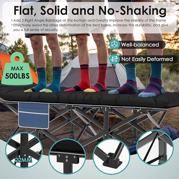 - 【Premium Material】Suteck adults camping cot bed is made of 25mm square anti-rust steel frame, durable 1mm thickened tubing and double layer 1200D Oxford cloth. Superior Strength, Water Resistance & Easy- Cleaning. More durable and supportive than 600D Oxford cloth, it can hold up to 900 lbs. There are 10 support legs, each with non-slip pads, and two right-angle bandages for stability and a comfortable sleep