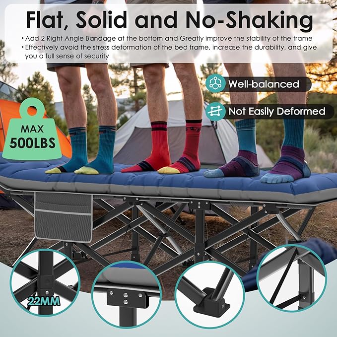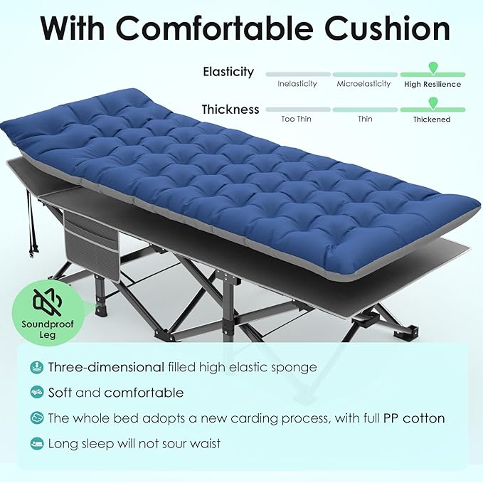 - 【Removable Skin-Friendly Mat】Our camping bed cot for adults has a soft and removable Mat, the 4" thicken cushion makes you more comfortable and warm when resting or sleeping. The cushion is made of skin-friendly and comfortable fabric, which is very suitable for people with sensitive skin or kids. You can also remove the mat when the weather is hot,and tie it up with the strap in it