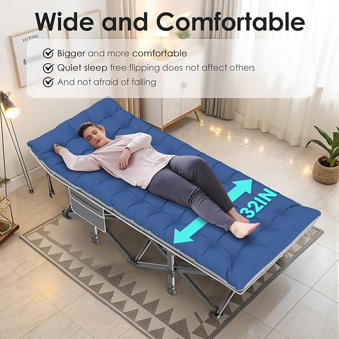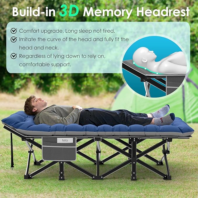 - 【Built-in Pillow Design】The headboard of our cot is a slanted design with built-in pillows, no need for extra pillows. The slight incline is ergonomically designed to ensure no more back, neck or shoulder pain in sleep! The mattress is also soft and thicker, so this is a very comfortable folding camping cot